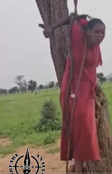 RSF commanders torture 22-year-old Gisma Ali Omer by hanging her from a tree.